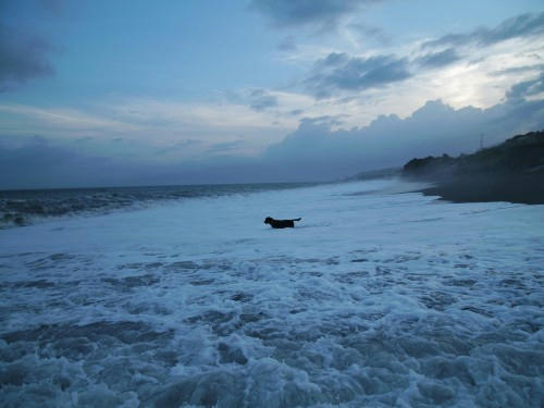 朝海に行ったら波が高いし雨は降ってるしで雰囲気的には短い散歩に思えた。でもだれもいない海だったので、海の入り口のドアのあるところまで歩いて行けた。夕方は雨が降ってなかったけどぱぱが少し早く帰ってきたので海に行けた。朝よりも波は低いみたいだけど気持ちの問題なのかも知れない。