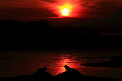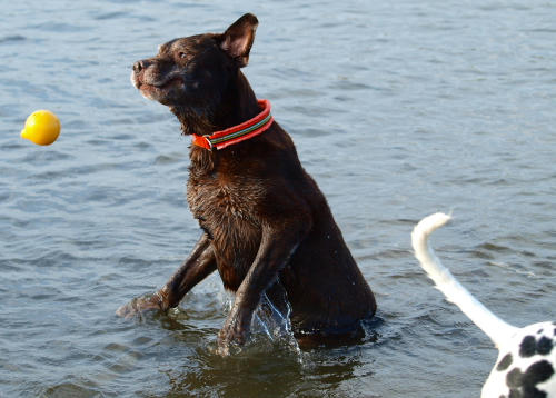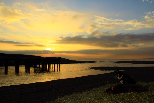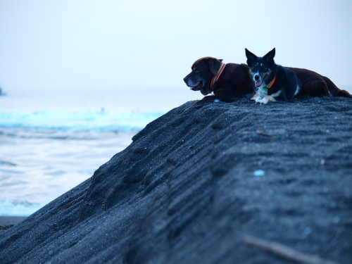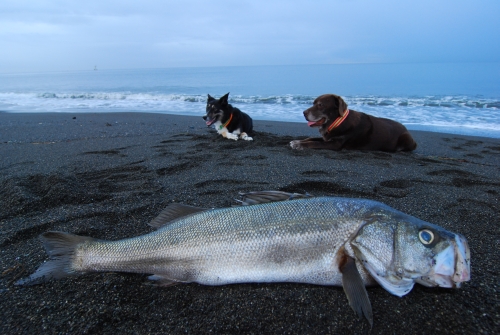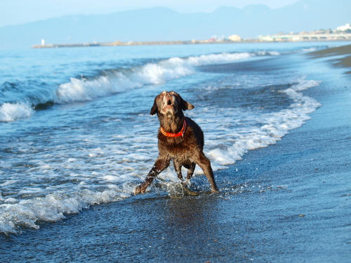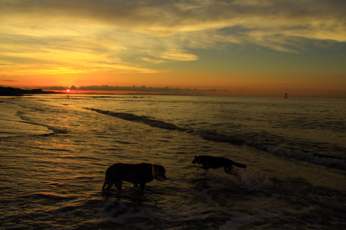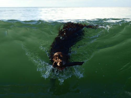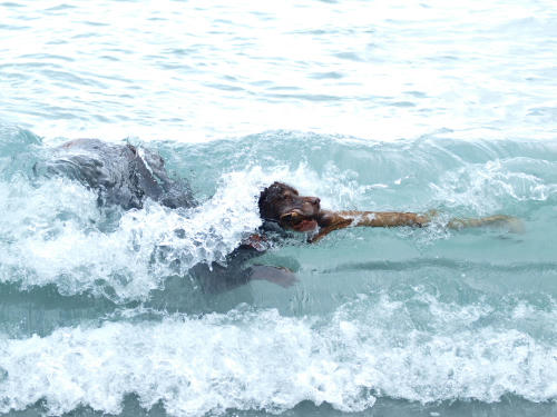 ぱぱが海へ出かける準備を始めたのはわりと遅めの時間で、海に着いた時間にはもう日ざしが強くなりそうな感じだった。仕方ないのですぐに水遊びをすることに決めたみたいで、近くに有った流木を拾って遊び始めた。ボクは波の小さなときを選んで泳いだり、休んだり、泳いだりやすんだりを繰り返して楽しんだ。