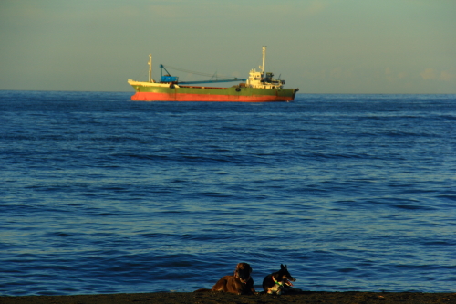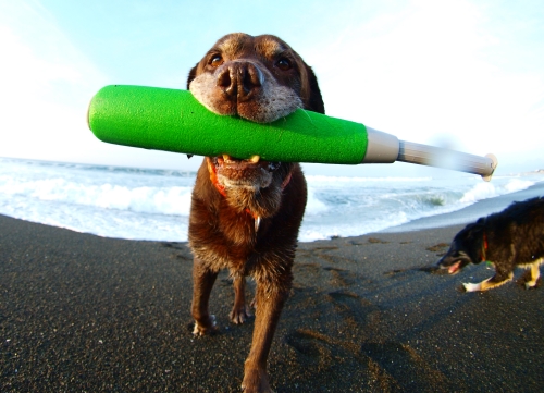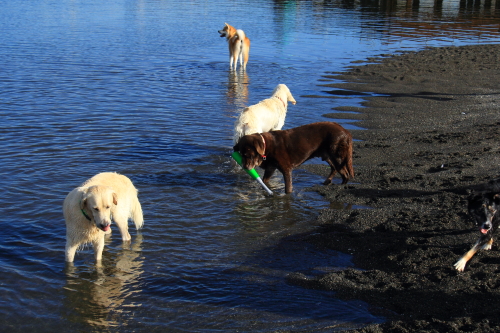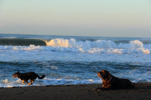 この写真を撮っててぱぱはボクタチがまだ水にも触れていないのに波に襲われてずぶ濡れになった。そしてお日さまが出てくるとボクを日陰に隠してウサをパイプのオモチャに乗せるのに夢中になっていたけど、パイプの支柱がすぐに倒れるので結局成功しないままに終わってしまっていた。ということでボクにとっては平和な状態で朝の海は推移して終わって幸せだった。