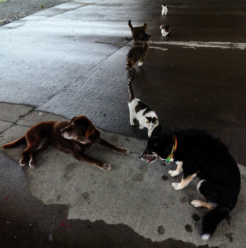 ネコさんたちがやってきて、濡れた
