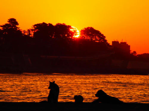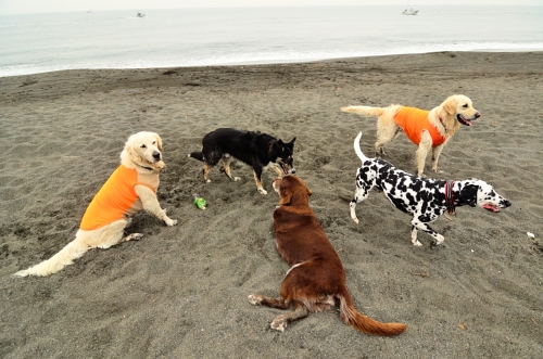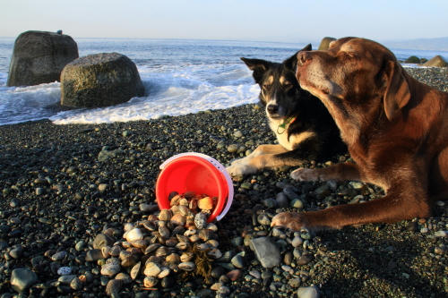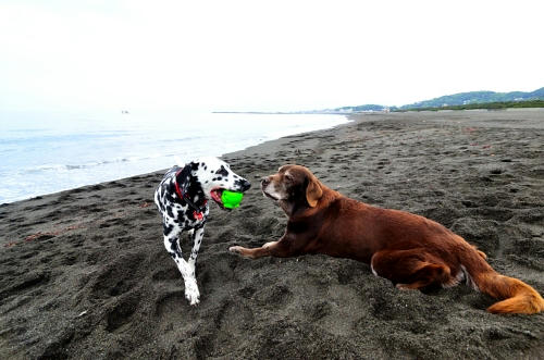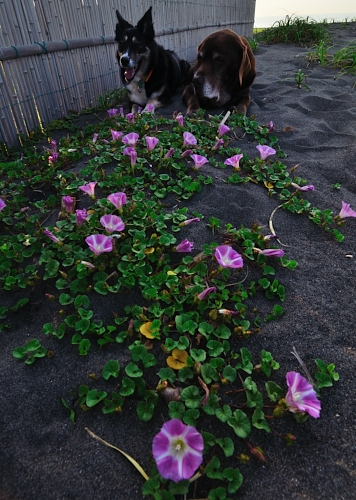 今日は涼しかったので、砂浜でぱぱを枕にして