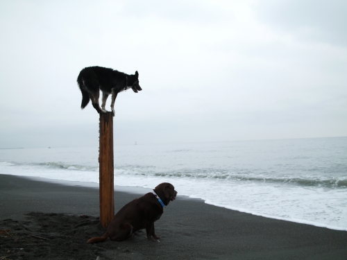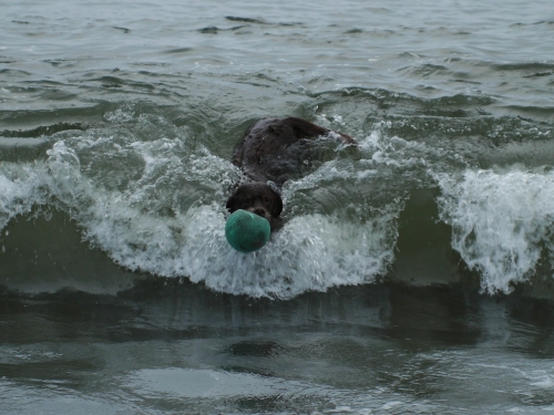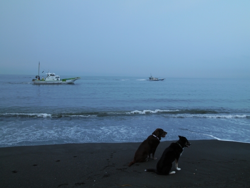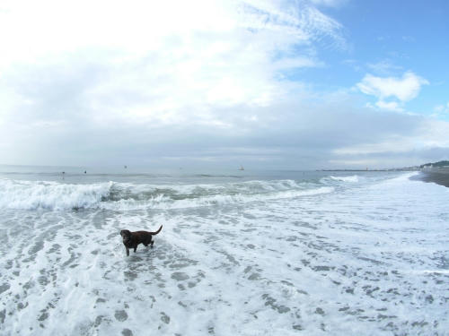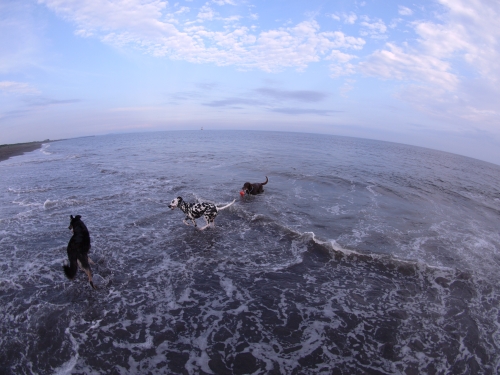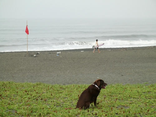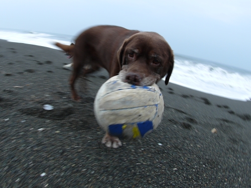 ウサは雨でも晴れでも自分が暑いと思えばぱぱの目を少し気にしながら海に肩まで浸かるのを楽しみにしてるので今日もあっという間にずぶぬれになった。ボクは今日は海に入ることにしてたのでボール遊びを楽しんだ。