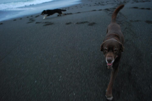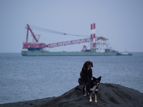 昨日ズイブン遊んだのでみんなお疲れ。海に行くのも惰性で行くだけって感じ。昨日の大荒れの天気で海もズイブンかわったのかな?っておもってたのにほとんどかわってないや。少し違うのは風を防ぐ柵が壊れてたって事ぐらいかな?前回の悪い天気で打ち寄せられた木や草は砂に埋まって小山になってる。