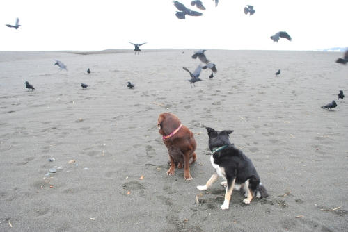 カラスさんはだるまさんが転んだの練習をしてるみたいだ。ボクたちが振り向いたら動いちゃいけないはずなのに、たくさん動いてるカラスさんが居るのは今日は雨なので初心者が多いからかな。