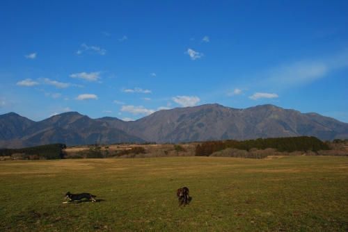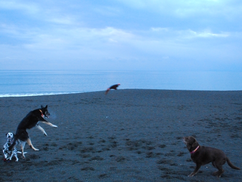 その次に出会ったのが、クロエちゃん。クロエちゃんとフリスビーで遊んでたらさっきのワンコがやってきた。ワンコのおかあさんはぱぱに「この子達はきょうだいですか」とボクとウサとクロエちゃんを指差して聞いた。ボクはかなり興味しんしんでぱぱの返事を待ったけど、ぱぱの返事はごく普通に「違います」だった。ボクとウサとクロエちゃんの共通のお母さんとお父さんってどんなのかボクには想像できなかった。