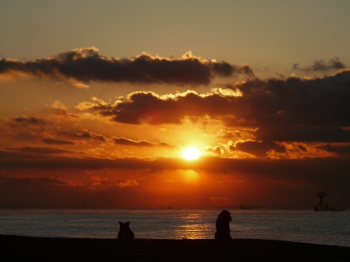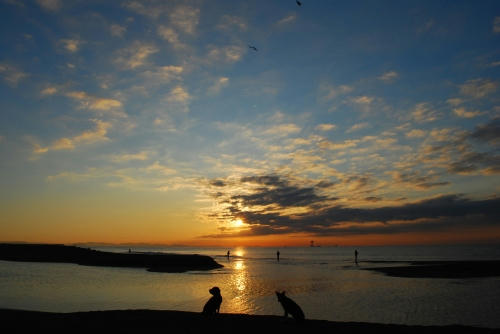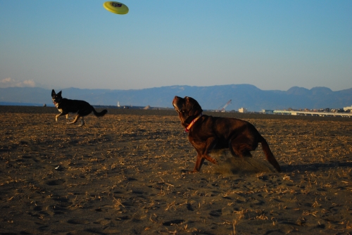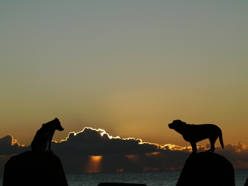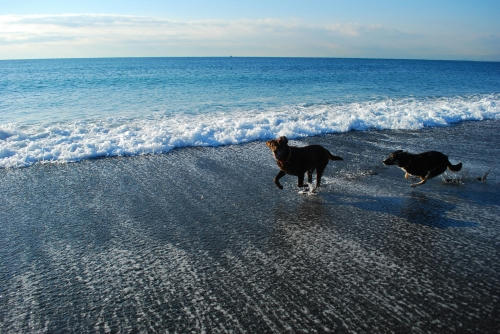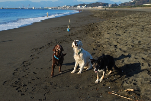ぱぱがゆっくり休める日は疲れるよね。朝はフリスビーで少しだけ遊んだ後、カラスさんたちに囲まれちゃったから、少しむかついてカラスさんを追っ払ったりして過ごした。そろそろおやつもおしまいかな?なんて思った頃クロエチャンたちと出会ってしばらくすると、ソフィちゃんが久しぶりに海にやってきた。