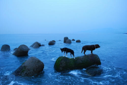 朝の海はかなり寒くてボクタチガ気ままに散策してるあいだ、手持ち無沙汰なぱぱはボクタチのパンをカラスさんにあげてた。