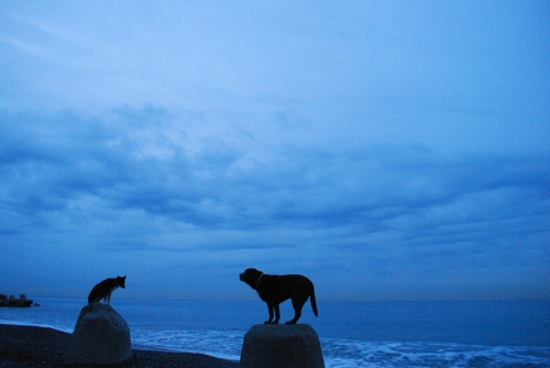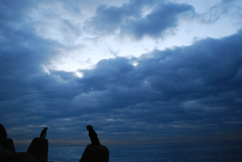 そんなことを考えながらパンを食べていつものとこにたどり着きそうだったんだけど、何故だか今日はいつもより時間がかかちゃったみたいで引き返した。お日さまも出てくるのに時間がかかったみたいでボクタチが海を後にした後で慌てて走ってきたみたいに真っ赤な顔をして出てきた。