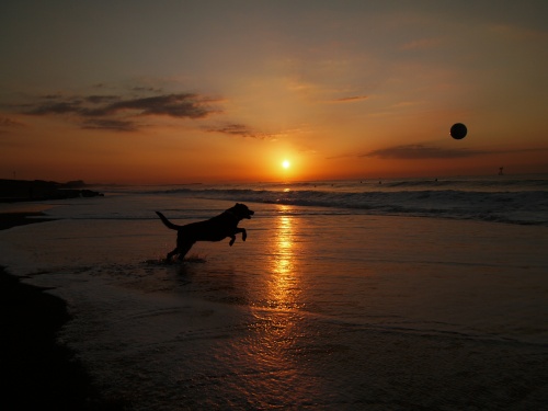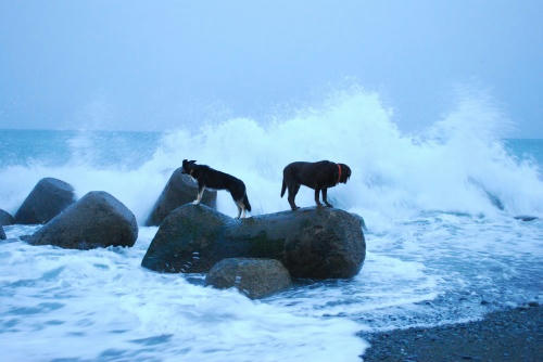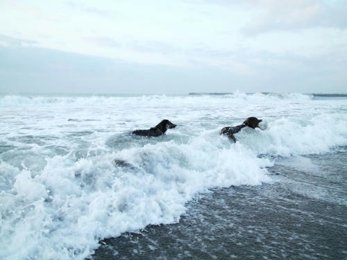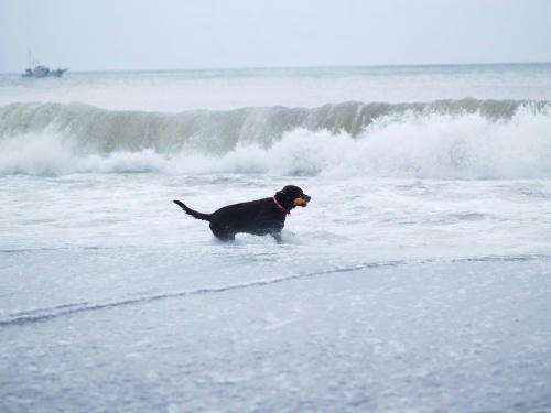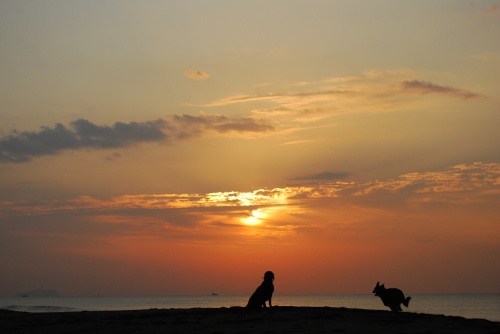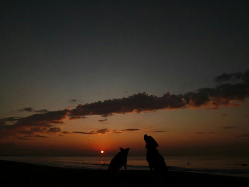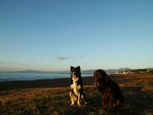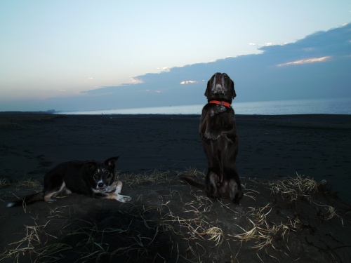 海に着いたけど暫くは暗くてあまり歩き回らなかった。少し明るくなったと思ったらぱぱがカメラのキャップを落としたとか言って暫く待たされた。今日は潮が引いてて波も高くなかったから波打ち際の辺りのフカフカの砂のあたりをぐるぐる回って遊んだけどボクの好みではなかったね。
