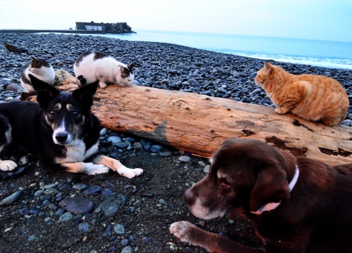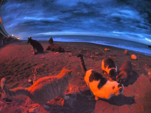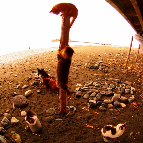 ネコさんたちは杭の周りにたむろしている。
