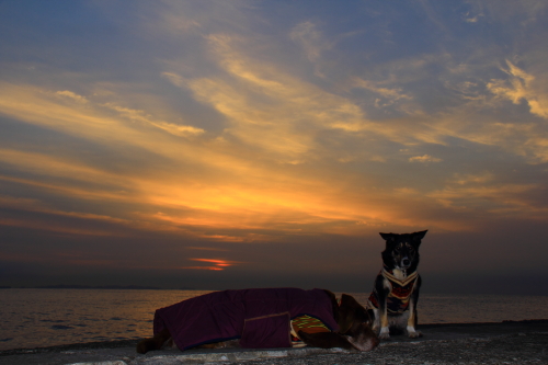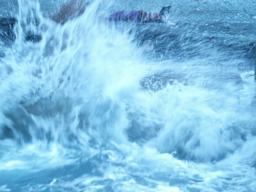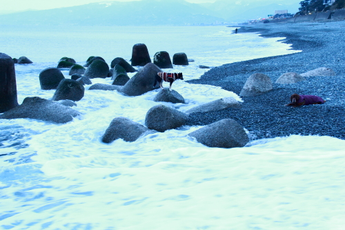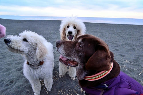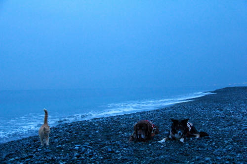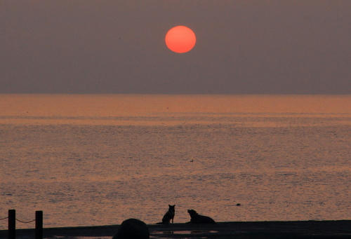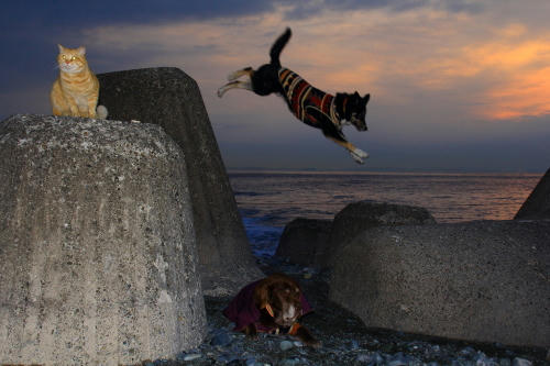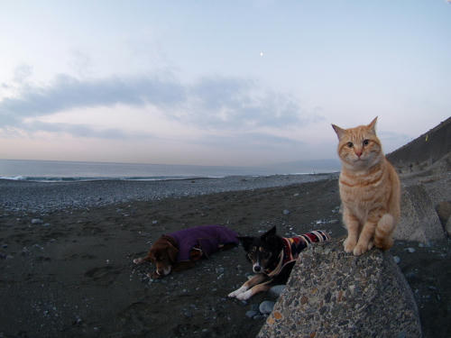 途中から海に向って歩いた。ネコさんはブロックの上で