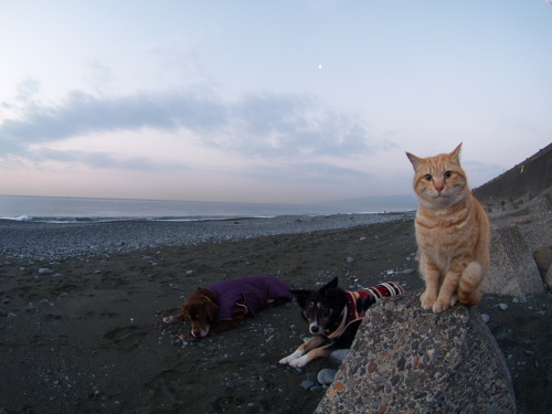 波打ち際を歩いていくと途中から別のネコさんの集団が