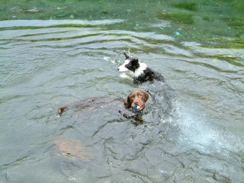 湖で泳いだ。 泳ぎはチェリーちゃんが一番速い。 最近太り気味なので水の抵抗が高いのが敗因か。