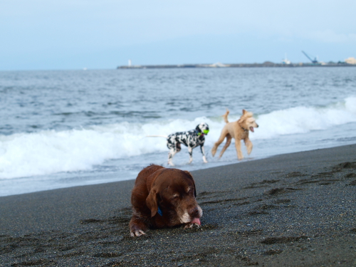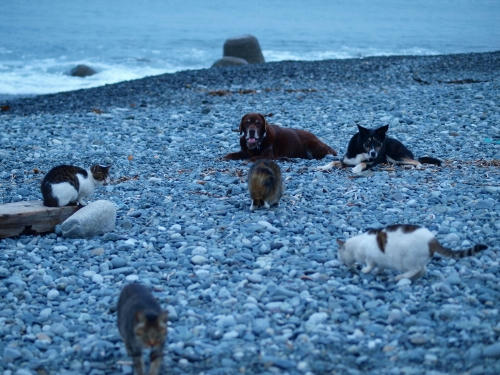なぜだかネコさんたちも暇みたいで、波打ち際のあたりで寝転んでいると