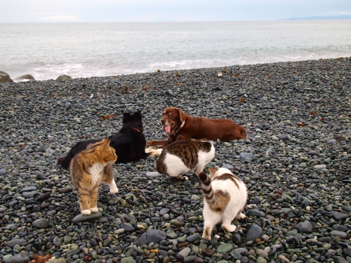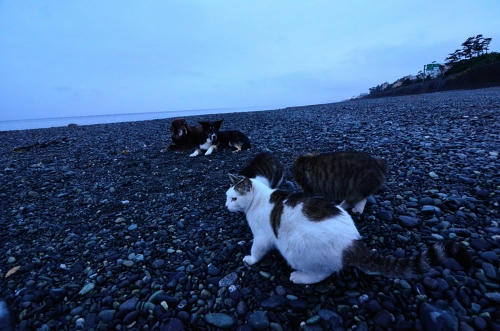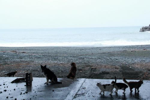 雨は少ししか降って無いからネコさんたちも海の方までついてくる。