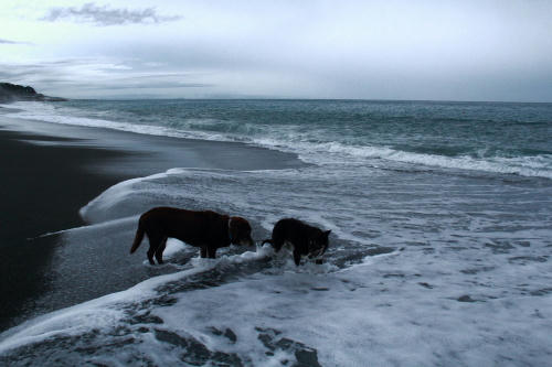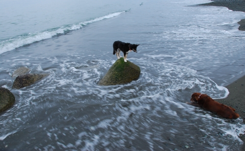 たぶんウサなら波が来るたびに大喜びで肩まで水に浸かるんだろうけど、