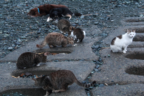 ネコさんたちの今日のおやつはマグロ。生のとゆでたのとを準備してきたみたい。